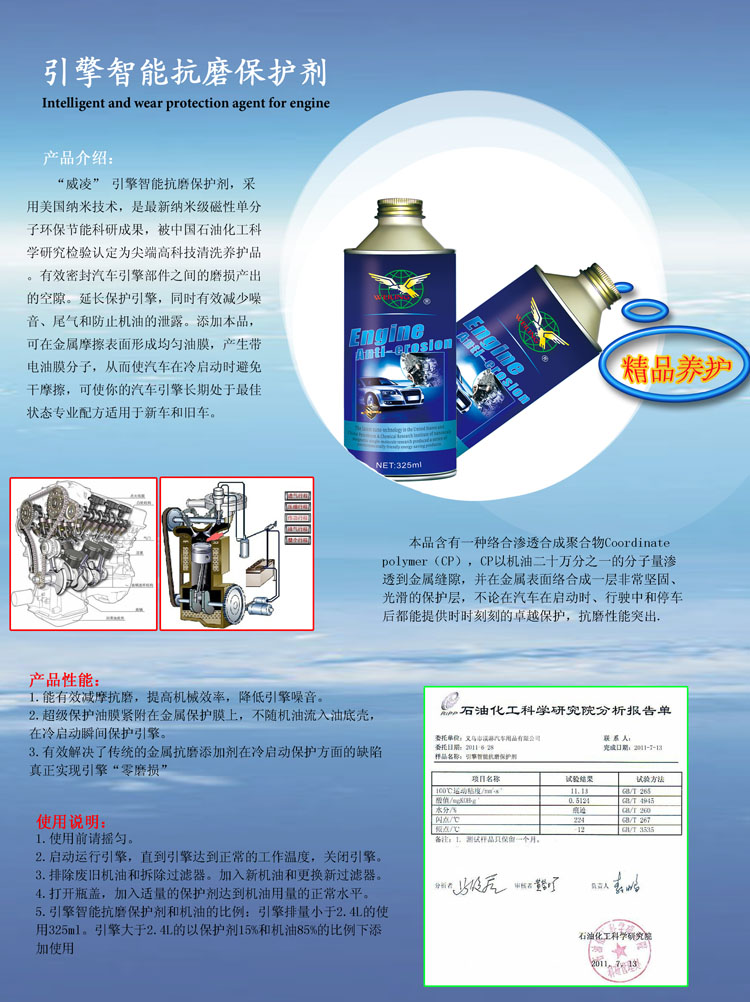 5.引擎智能抗磨保護劑和機油的比例:引擎排量小于2.4L的使用325ml。引擎大于2.4L的以保護劑15%和機油85%的比例下添加使用