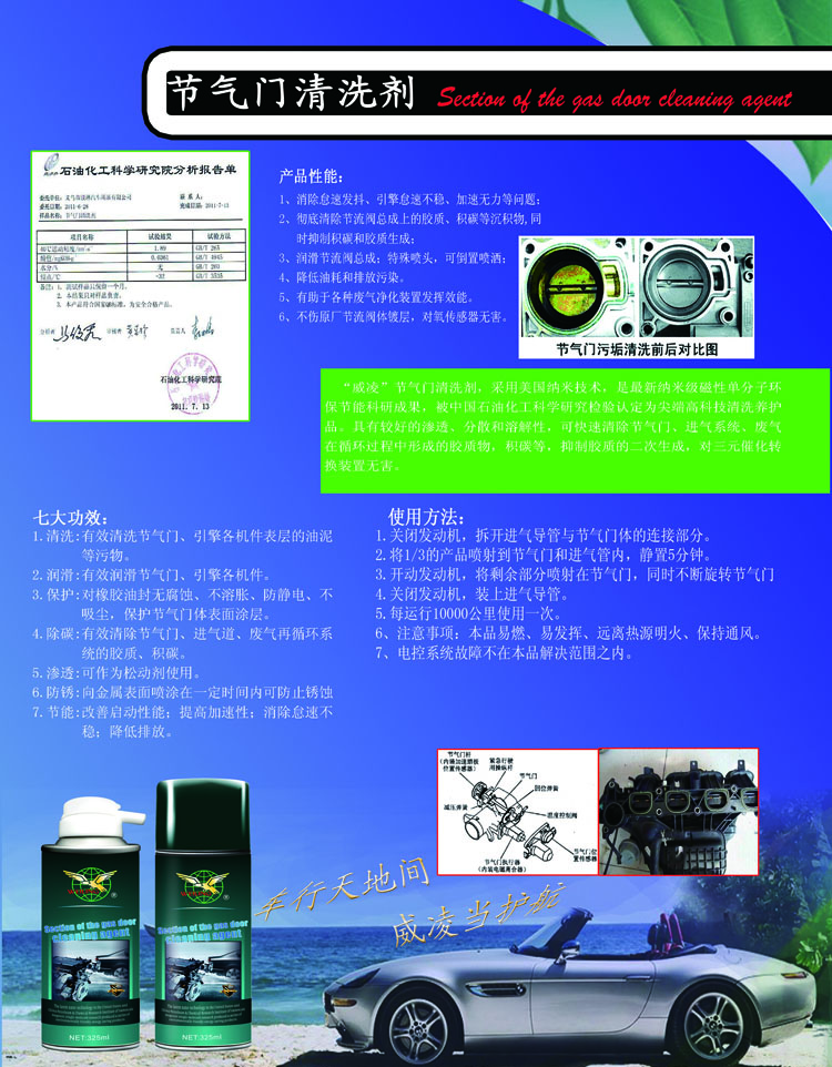 “威凌”節氣門清洗劑,是美國納米技術,新納米級磁性單分子環保節能科研成果,被中國石油化工科學研究檢驗認定為尖端高科技清洗養護品。具有較好的滲透、分散和溶解性,可快速清除節氣門、進氣系統、廢氣在循環過程中形成的膠質物,積碳等,抑制膠質的二次生成,對三元催化轉換裝置無害。
